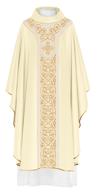 Ornat wykonany z wysokiej jakości tkaniny gładkiej, zdobiony pasem haftowanym na aksamicie. Całość wykończona złoto-satynową lamówką. Dostępny we wszystkich kolorach liturgicznych.