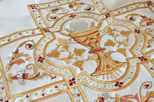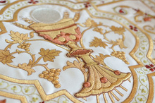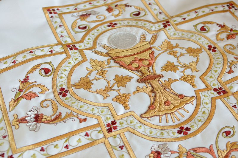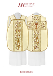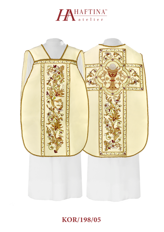 Ornat rzymski wykonany z wysokiej jakości tkaniny gładkiej, bogato zdobiony z symbolem kielicha eucharystycznego. Całość wykończona złoto-satynową lamówką. Dostępny we wszystkich kolorach liturgicznych.