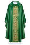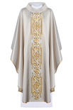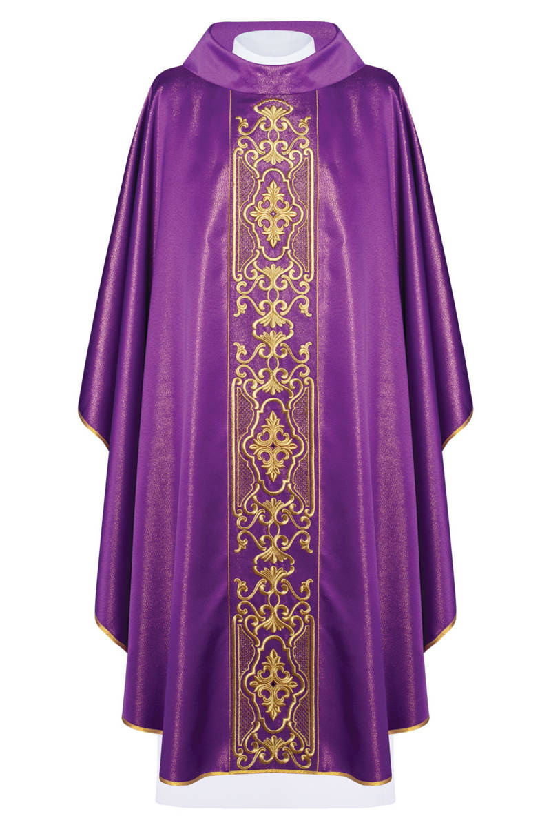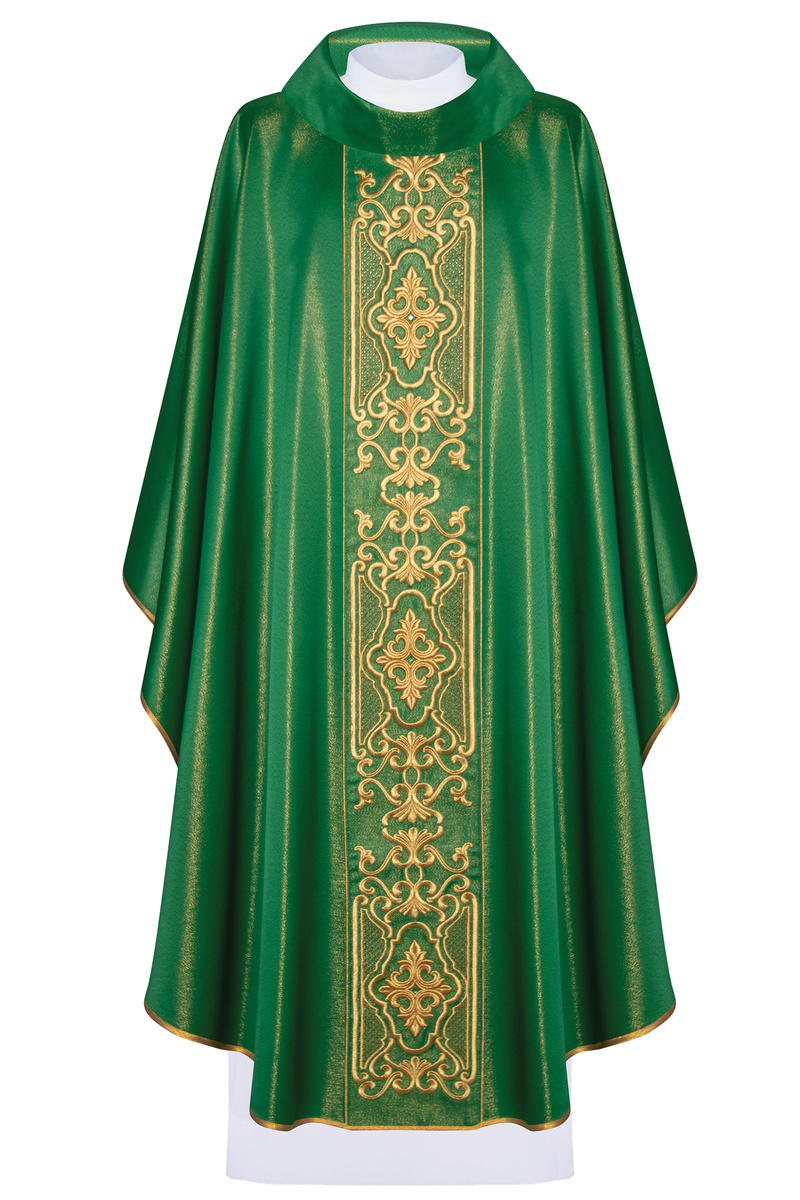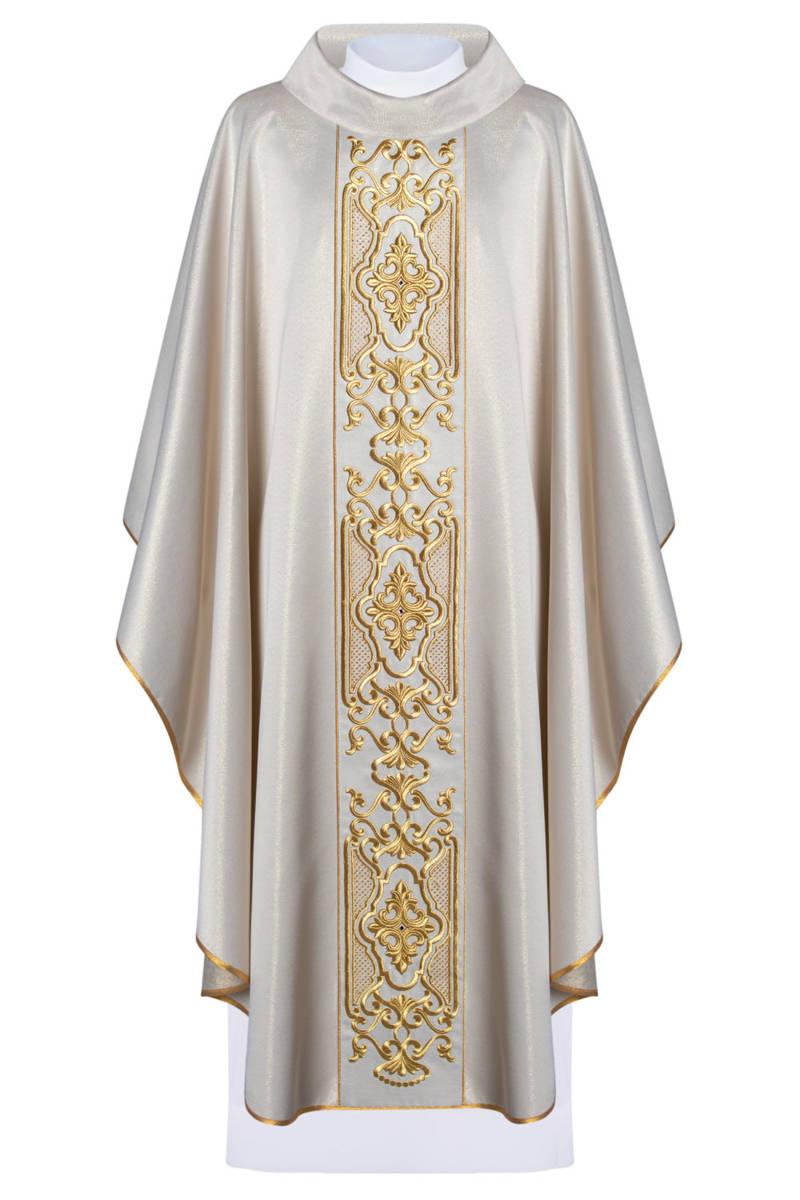 Ornat wykonany z bardzo wysokiej jakości tkaniny połyskującej. Szata bogato haftowana, ozdobiona kamieniami i koralikami. Tkanina miła w dotyku. Kołnierz typu golf.