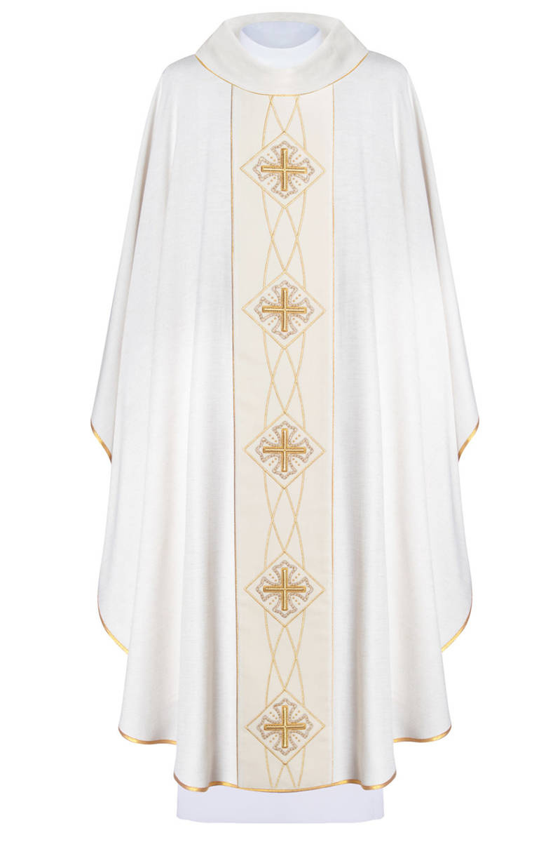 Ornat wykonany z bardzo wysokiej jakości tkaniny. Szata bogato haftowana, pas oraz kołnierz z aksamitu. Tkanina bardzo miła w dotyku. Kołnierz typu golf.