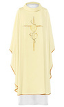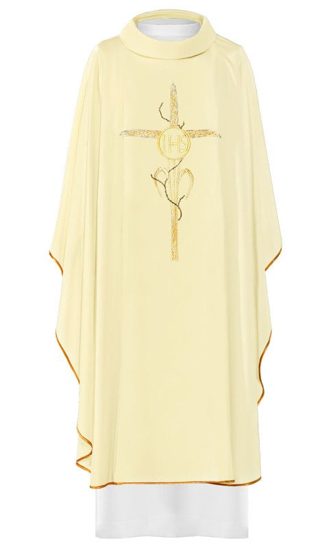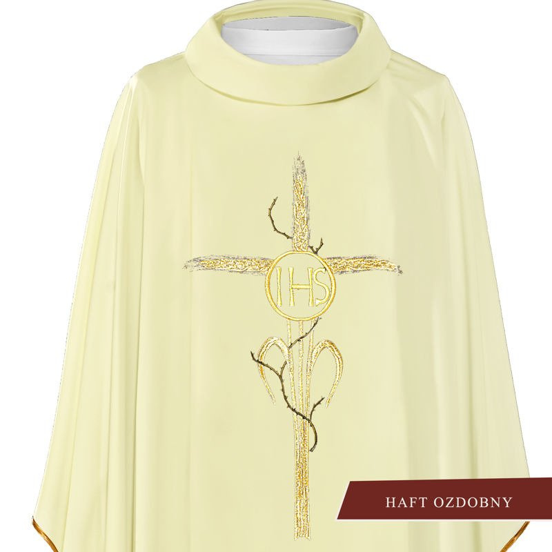Ornat wykonany z wysokiej jakości tkaniny gładkiej, zdobiony pasem z haftowanym symbolem IHS. Całość wykończona złoto-satynową lamówką. Dostępny we wszystkich kolorach liturgicznych.
