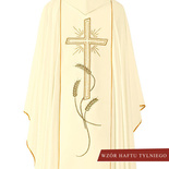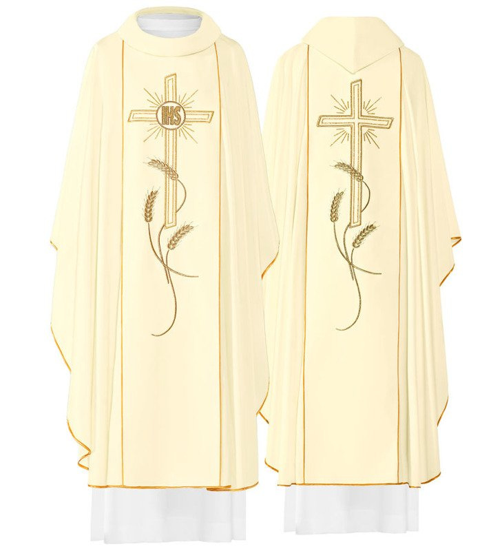 Ornat wykonany z wysokiej jakości tkaniny gładkiej, zdobiony symbolem Krzyża z symbolem IHS, tył ornatu zdobiony symbolem krzyża. Całość wykończona złoto-satynową lamówką. Dostępny we wszystkich kolorach liturgicznych.