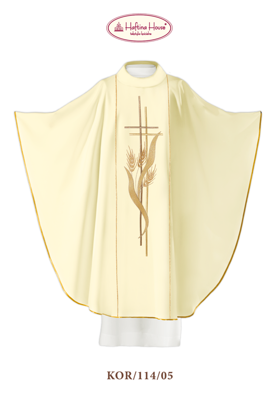 Ornat z pasem zdobiony haftem w kolorze złotym.Wykonany z wysokiej jakości tkaniny gładkiej. Całość wykończona satynową lamówką. Standardowa długość szaty 130cm. Dostępny we wszystkich kolorach liturgicznych. Wykończenie kołnierza typu golf, jest możliwość zamówienia kołnierza typu karo. Ornat ze stułą wewnętrzną w komplecie. Tkanina standard 80%PE,20%WOL