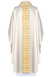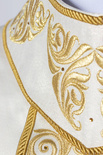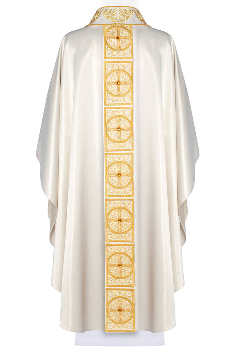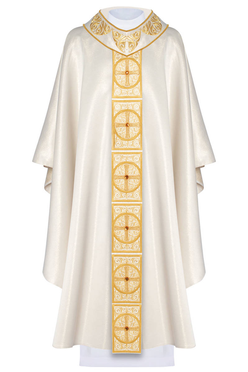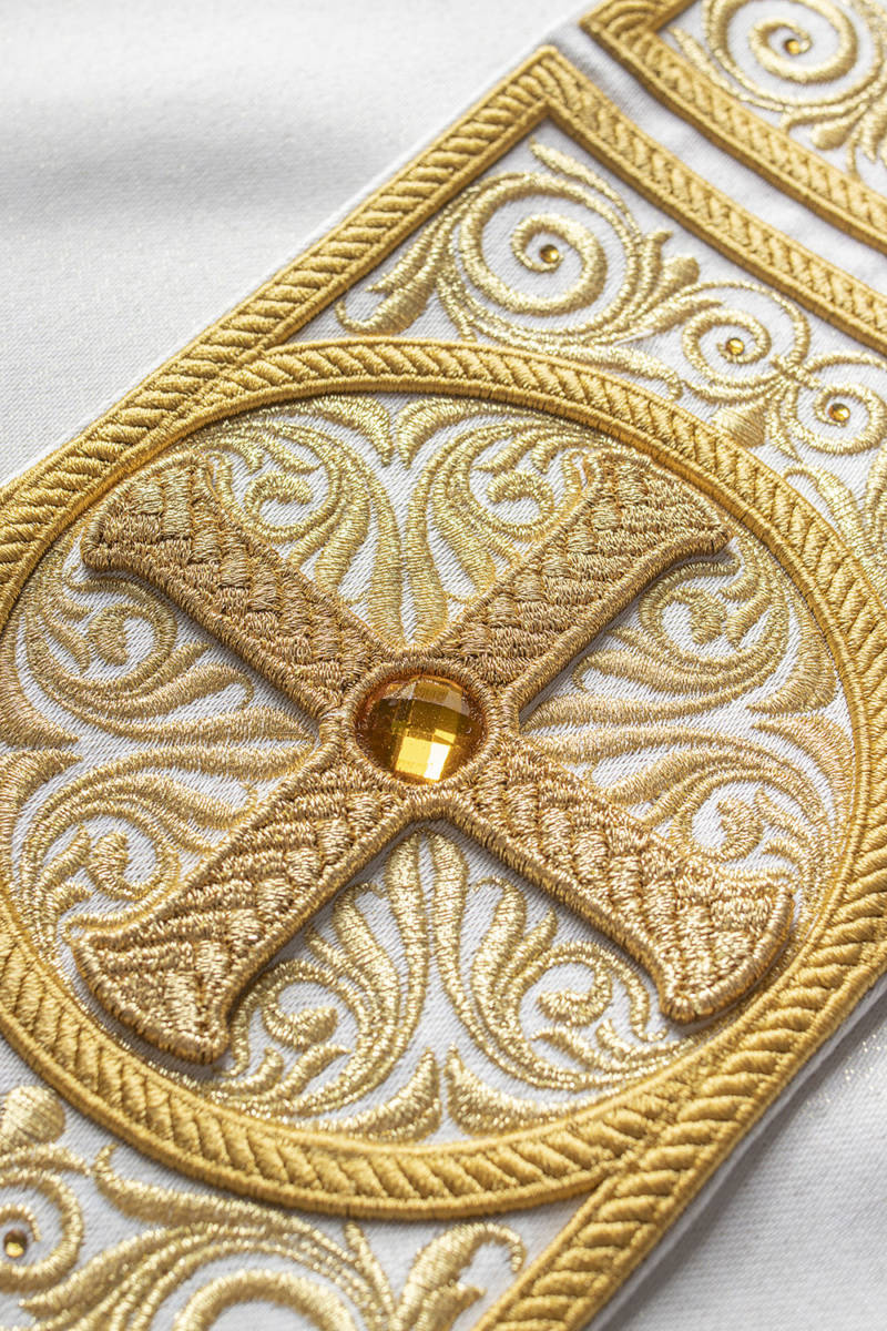 Ornat wykonany z bardzo wysokiej jakości tkaniny. Szata z bogato haftowanym pasem, udekorowana kamieniami fasetowanymi. Kołnierz typu golf.