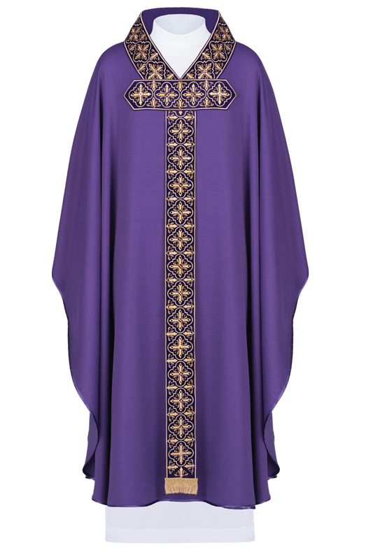 Ornat wykonany z bardzo wysokiej jakości tkaniny gładkiej. Szata z bogato haftowanym pasem i kołnierzem z motywem krzyża i udekorowana kamieniami fasetowanymi. Całość wykończona lamówką w kolorze ornatu. Stuła wewnętrzna w komplecie.