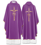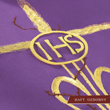 Ornat wykonany z wysokiej jakości tkaniny gładkiej, zdobiony pasem z haftowanym symbolem IHS. Całość wykończona złoto-satynową lamówką. Dostępny we wszystkich kolorach liturgicznych.