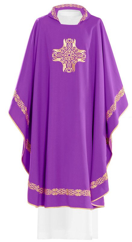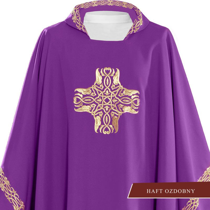 Ornat wykonany z wysokiej jakości tkaniny gładkiej, zdobiony haftowanym symbolem Krzyża. Całość wykończona złoto-satynową lamówką. Dostępny we wszystkich kolorach liturgicznych.