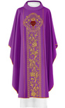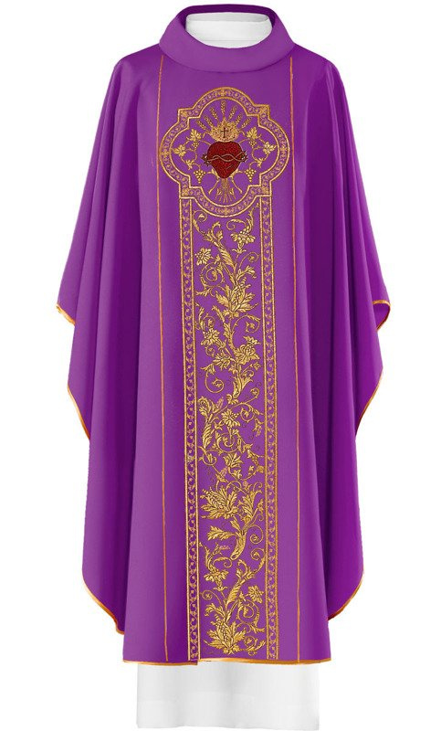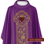 Ornat z pasem bogato zdobiony haftem w kolorze złotym. Symbol SERCA i PAX wypukłe. Wykonany z wysokiej jakości tkaniny gładkiej. Całość wykończona złoto - satynową lamówką. Standardowa długość szaty 130cm. Dostępny we wszystkich kolorach liturgicznych. Wykończenie kołnierza typu golf, jest możliwość zamówienia kołnierza typu karo. Ornat ze stułą wewnętrzną w komplecie. Tkanina standard 80%PE,20%WOL