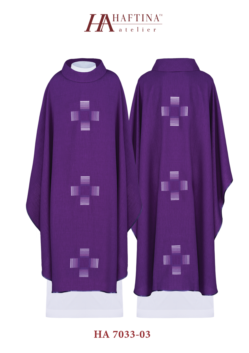 Ornat w kolorze fioletowym wykonany z wysokiej jakości tkaniny gładkiej. Z przodu i z tyłu ornatu znajdują się trzy jednakowe krzyże na szerokim pasie. Całość wykończona satynową lamówką. Wykończenie kołnierza typu golf. Stuła wewnętrzna w komplecie.