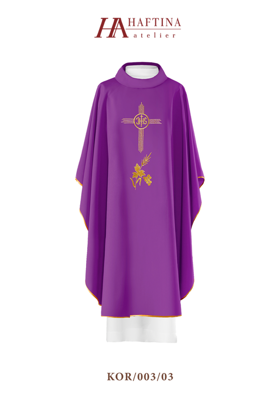Ornat wykonany z wysokiej jakości tkaniny gładkiej, zdobiony bogatym haftem z symbolem IHS. Całość wykończona złoto-satynową lamówką. Dostępny we wszystkich kolorach liturgicznych.