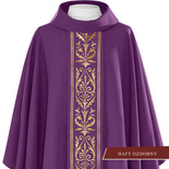 Ornat wykonany z wysokiej jakości tkaniny gładkiej, zdobiony pasem haftowanym. Całość wykończona złoto-satynową lamówką. Dostępny we wszystkich kolorach liturgicznych.