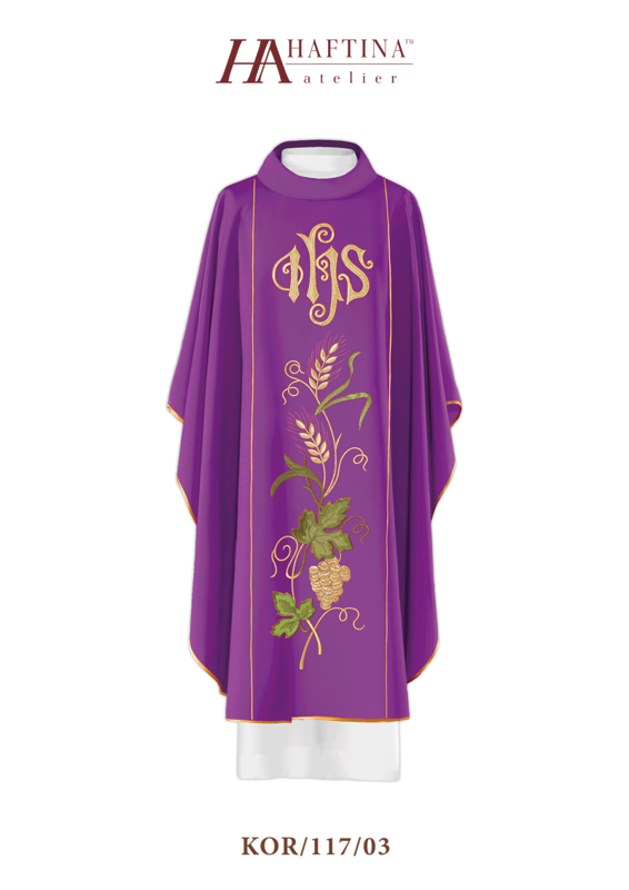 • Fioletowy ornat na pasie haftowany symbolem IHS i motywami kłosów i winogron