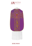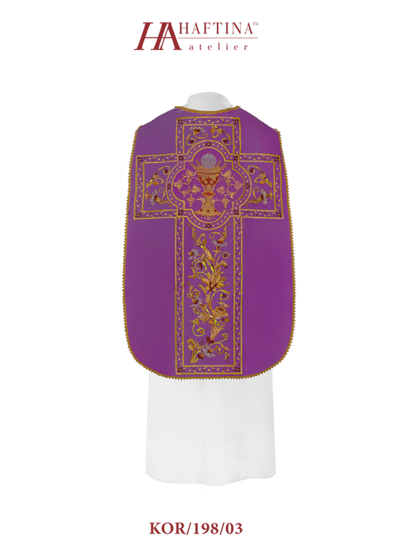 Ornat rzymski wykonany z wysokiej jakości tkaniny gładkiej, bogato zdobiony z symbolem kielicha eucharystycznego. Całość wykończona złoto-satynową lamówką. Dostępny we wszystkich kolorach liturgicznych.