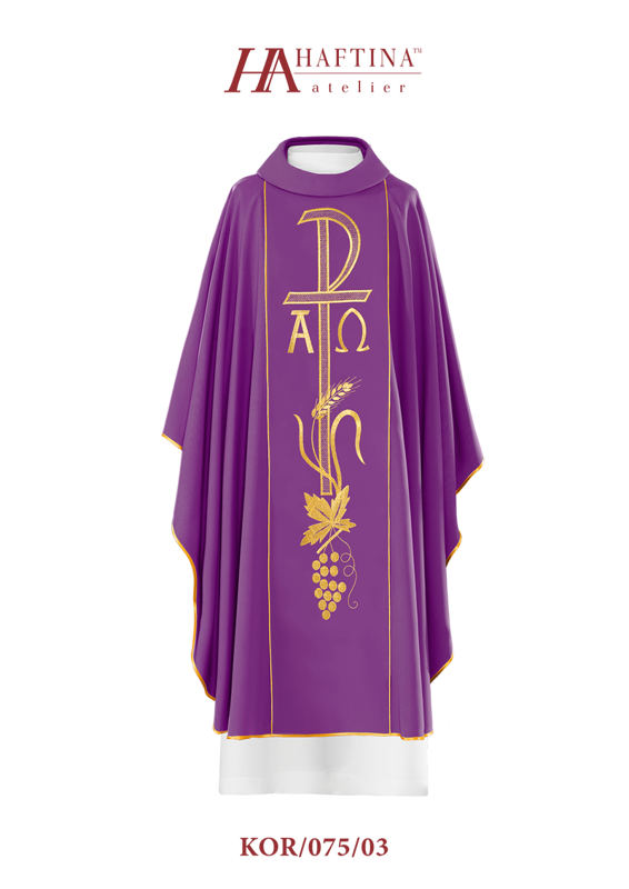 Fioletowy ornat z haftem Alfa i Omega na pasie