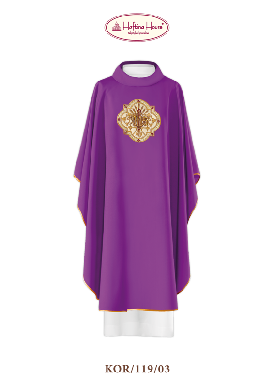 Ornat zdobiony haftem w kolorze złotym. Wykonany z wysokiej jakości tkaniny gładkiej. Całość wykończona złoto - satynową lamówką. Standardowa długość szaty 130cm. Dostępny w kolorze ecru i złotym.Wykończenie kołnierza typu golf, jest możliwość zamówienia kołnierza typu karo. Ornat ze stułą wewnętrzną w komplecie. Tkanina standard 80%PE,20%WOL
