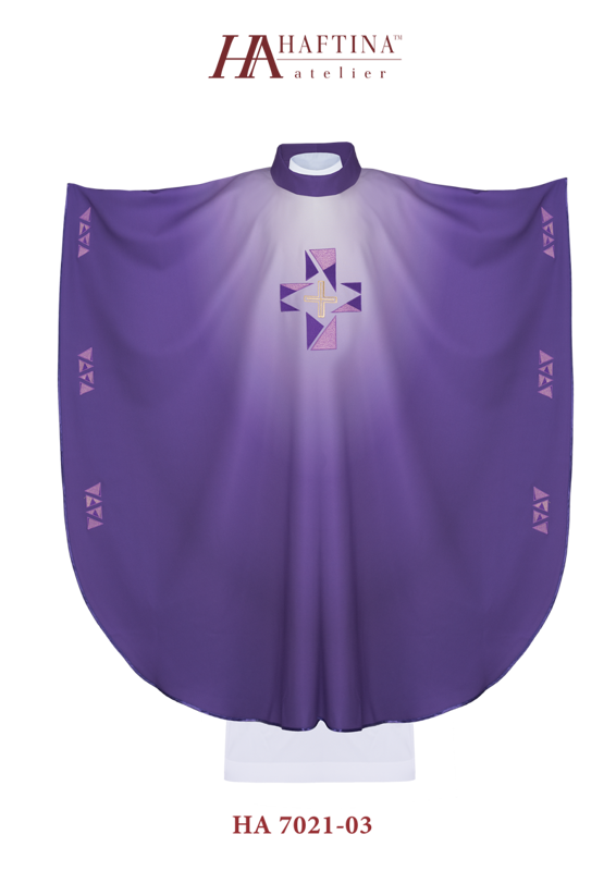 Ornat wykonany z wysokiej jakości tkaniny gładkiej, zdobiony sublimacją,haftowanym symbolem krzyża i haftowanymi wzorami dookoła boków ornatu.  Całość wykończona satynową lamówką w kolorze materiału. Dostępny we wszystkich kolorach liturgicznych. Wykończenie kołnierza typu golf. Stuła wewnętrzna w komplecie.