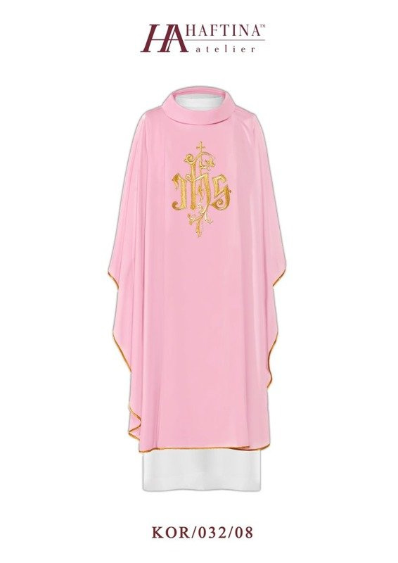 Ornat wykonany z wysokiej jakości tkaniny gładkiej, zdobiony bogatym haftem z symbolem IHS. Całość wykończona złoto-satynową lamówką. Dostępny we wszystkich kolorach liturgicznych.