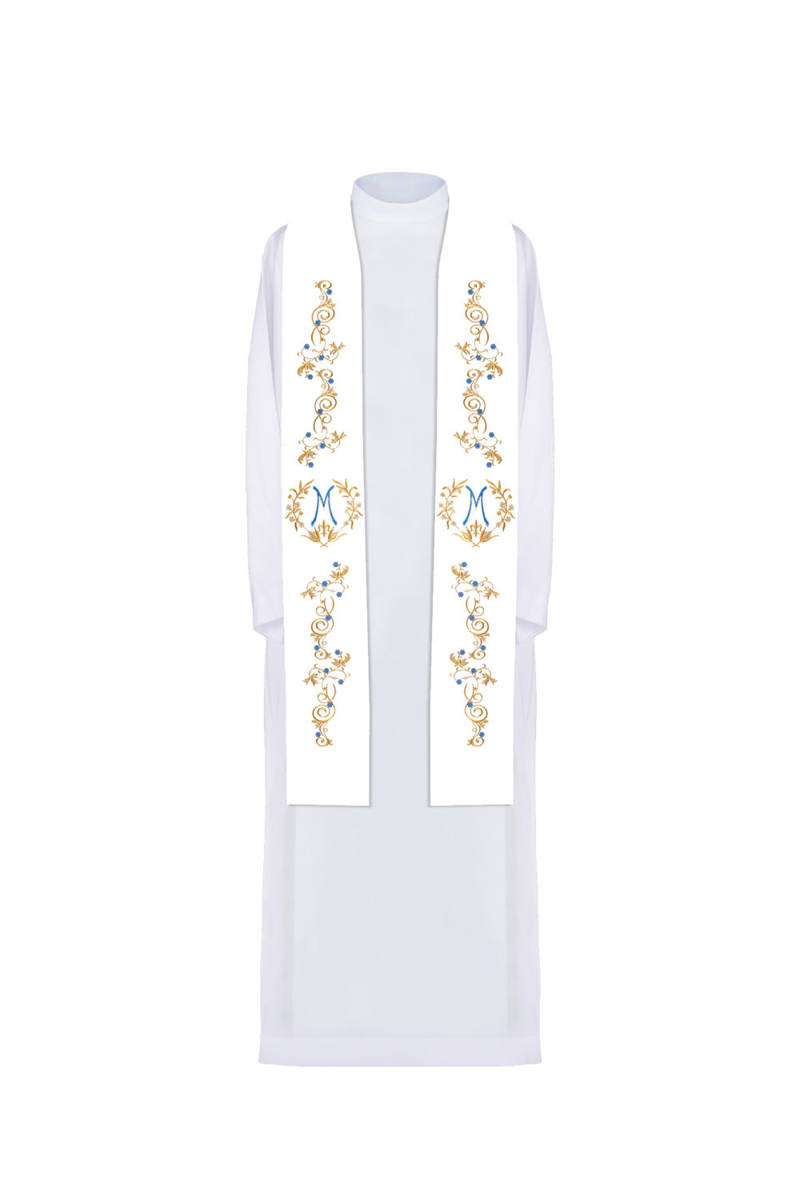 Stuła jednostronna wykonana z wysokiej jakości tkaniny. Stuła haftowana z motywem maryjnym.