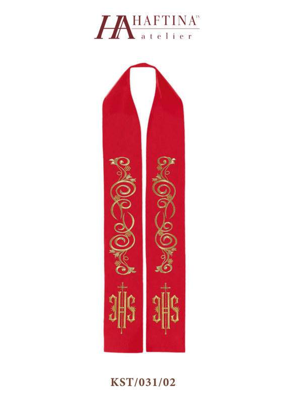 Stuła jednostronna wykonana z wysokiej jakości tkaniny gładkiej, zdobiona haftem z symbolem IHS.