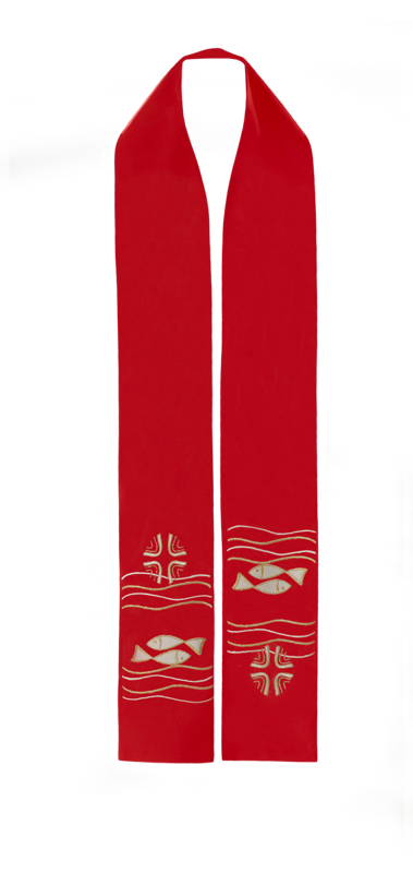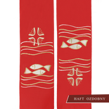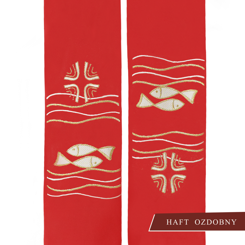 Stuła jednostronna wykonana z wysokiej jakości tkaniny gładkiej, zdobiona bogatym haftem z symbolem Ryby.