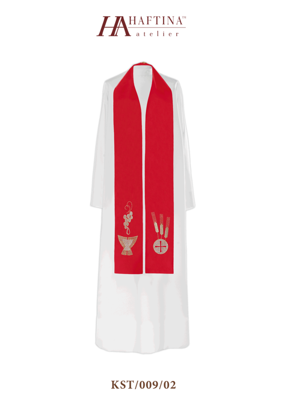 Stuła jednostronna wykonana z wysokiej jakości tkaniny gładkiej, zdobiona bogatym haftem eucharystyczny w kolorze złotym.