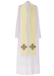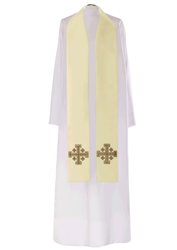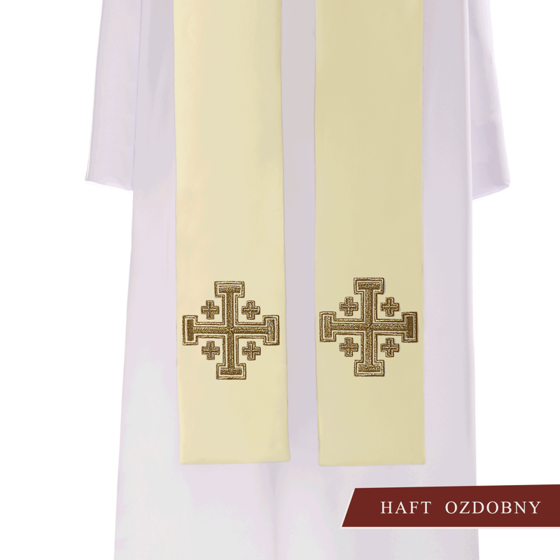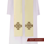 Stuła jednostronna wykonana z wysokiej jakości tkaniny gładkiej, zdobiona bogatym haftem z symbolem Alfa i Omega.