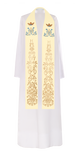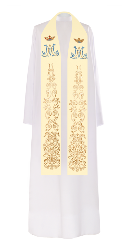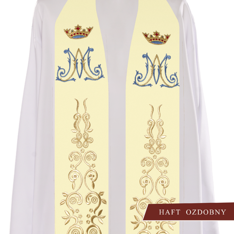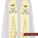 Stuła jednostronna wykonana z wysokiej jakości tkaniny gładkiej, zdobiona bogatym haftem z symbolem Maryjnym z koroną.
