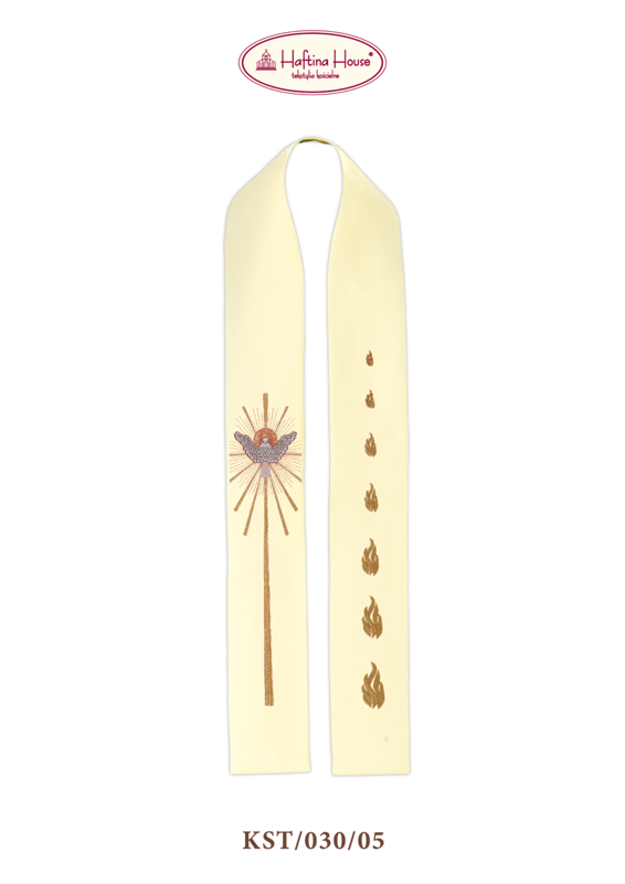 Stuła jednostronna zdobiona haftem (symbol Ducha Św. i płomieni), nićmi złotymi metalizowanymi. Wykonana z wysokiej jakości tkaniny gładkiej (80%Poliester,20%Wełna). Dostępna w kolorze czerwonym i ecru. Wymiar standardowy szerokość 16 cm, długość ramienia 130cm.