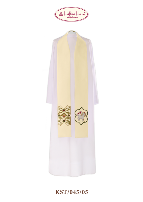 Stuła jednostronna wykonana z wysokiej jakości tkaniny gładkiej, zdobiona haftowanym symbolem "Agnus Dei". Dostępna we wszystkich kolorach liturgicznych. tkanina standard: 80% Poliester, 20% Wełna. Wymiary: szerokość 16cm, długość ramienia 130cm.