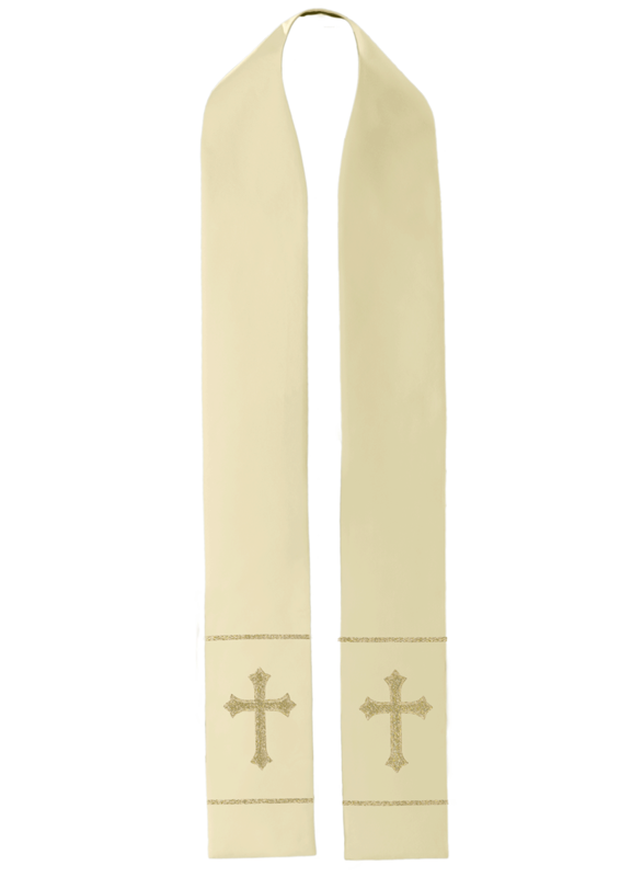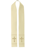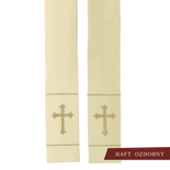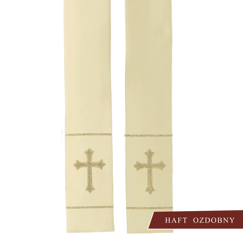 Stuła jednostronna wykonana z wysokiej jakości tkaniny gładkiej, zdobiona bogatym haftem eucharystyczny w kolorze złotym.