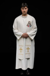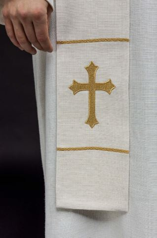 Stuła z wysokiej jakości tkaniny, zdobiony haftem z wizerunkiem Jezusa i krzyżami na dole.