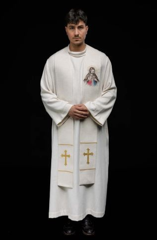 Stuła wykonana z wysokiej jakości tkaniny, zdobiona haftem z wizerunkiem Jezusa Miłosiernego.