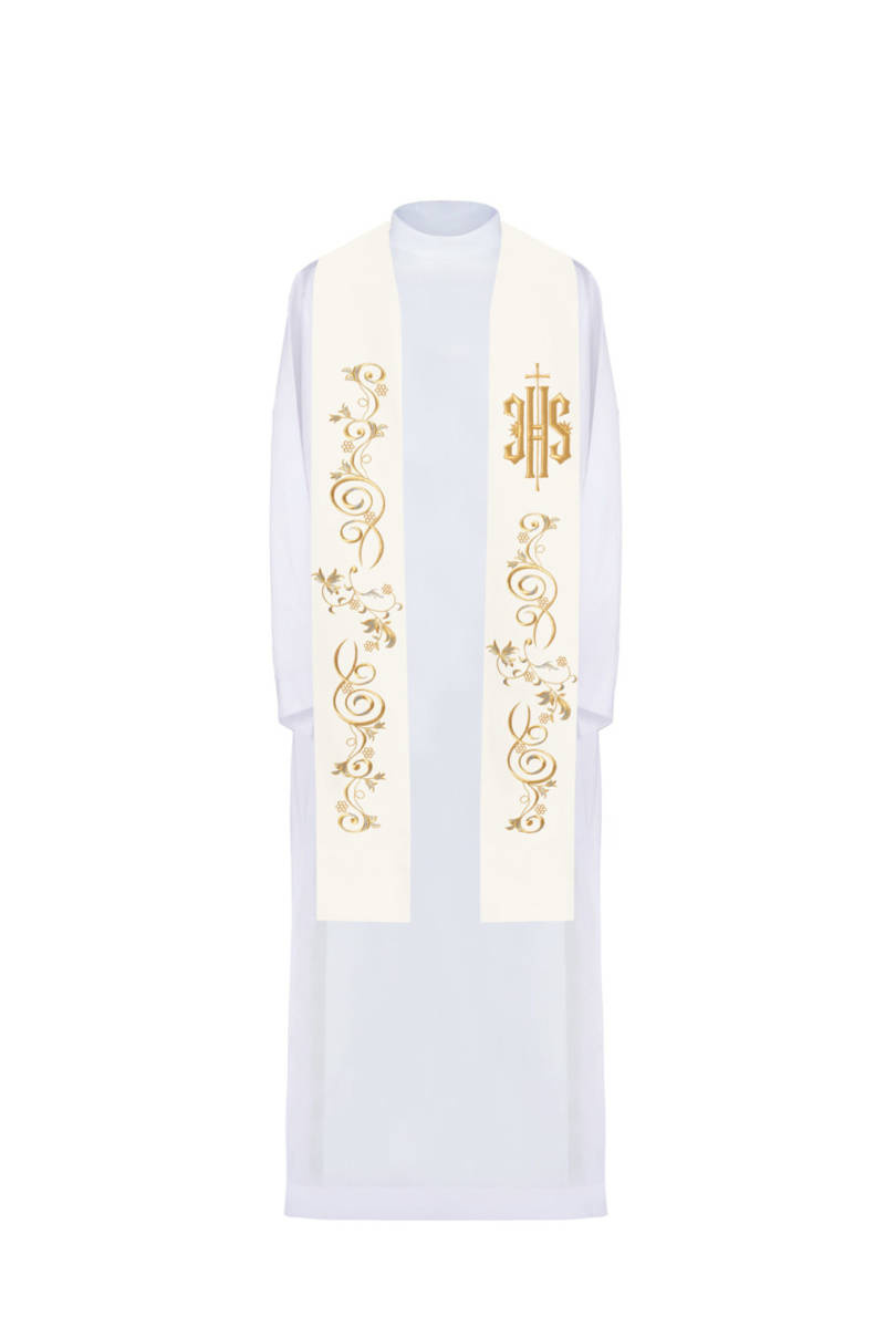 Stuła jednostronna wykonana z wysokiej jakości tkaniny gładkiej, zdobiona haftem z symbolem IHS.