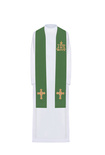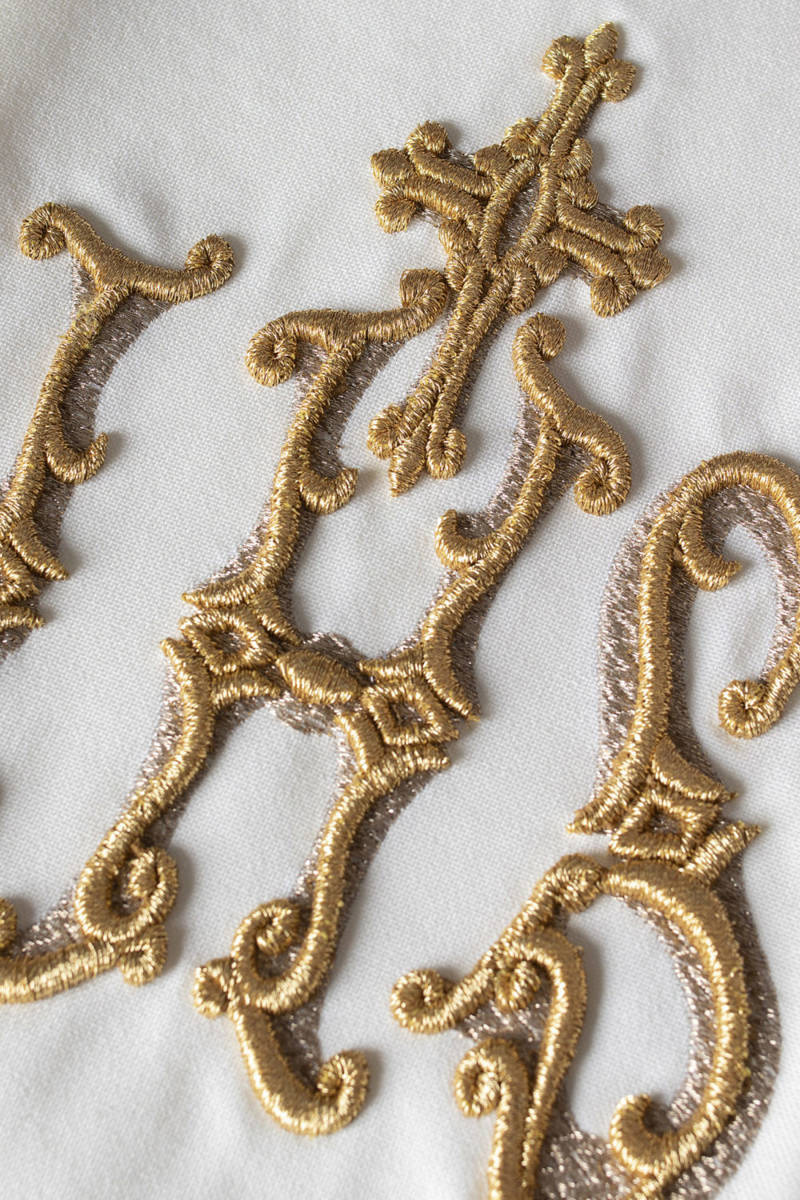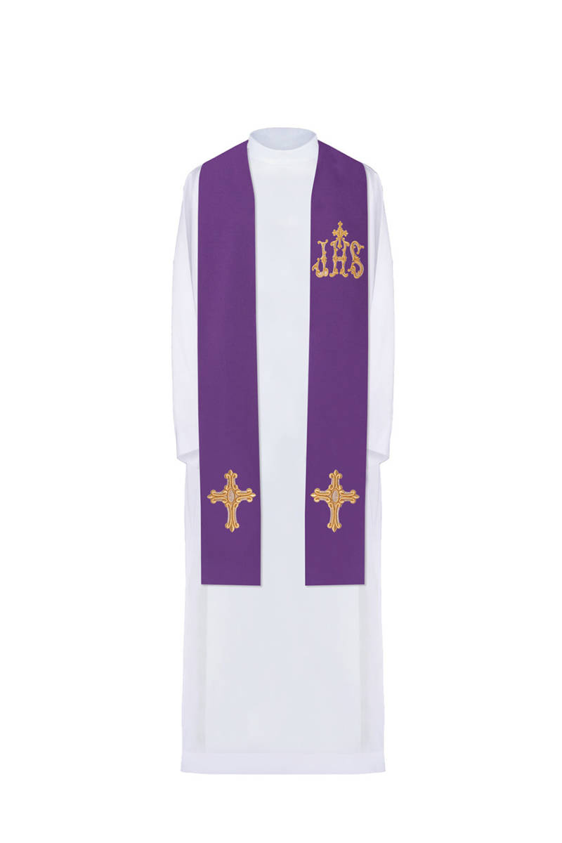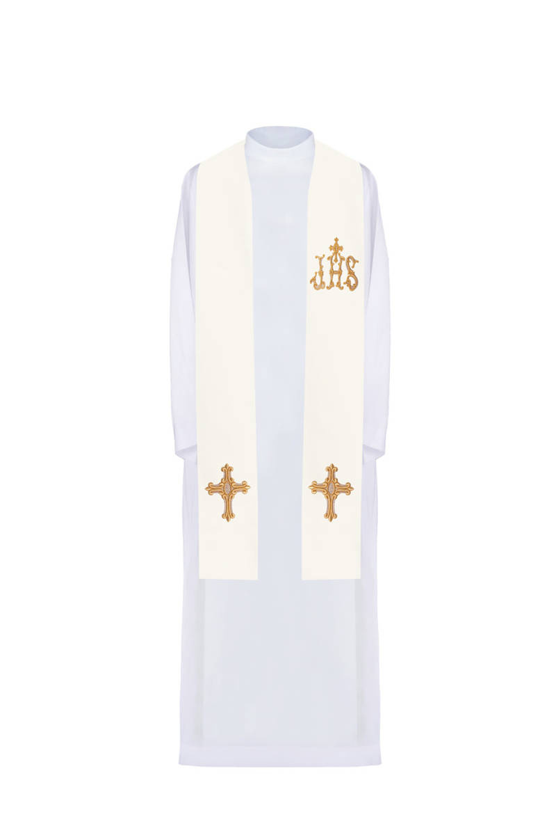Stuła kapłańska wykonana z wysokiej jakości tkaniny gładkiej, zdobiona haftem z symbolem krzyża i IHS. Haft trójwymiarowy, wypukły.