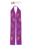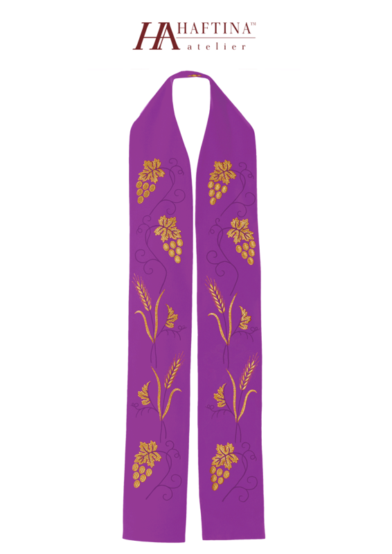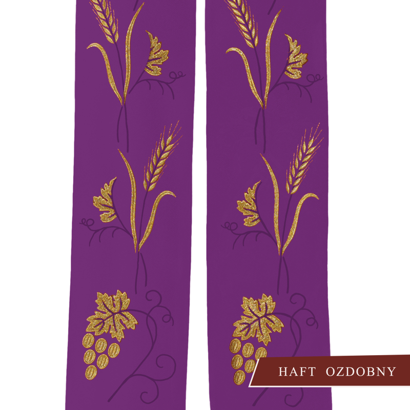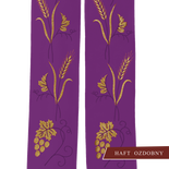 Stuła jednostronna wykonana z wysokiej jakości tkaniny gładkiej, zdobiona bogatym haftem z symbolem winogron i kłosów