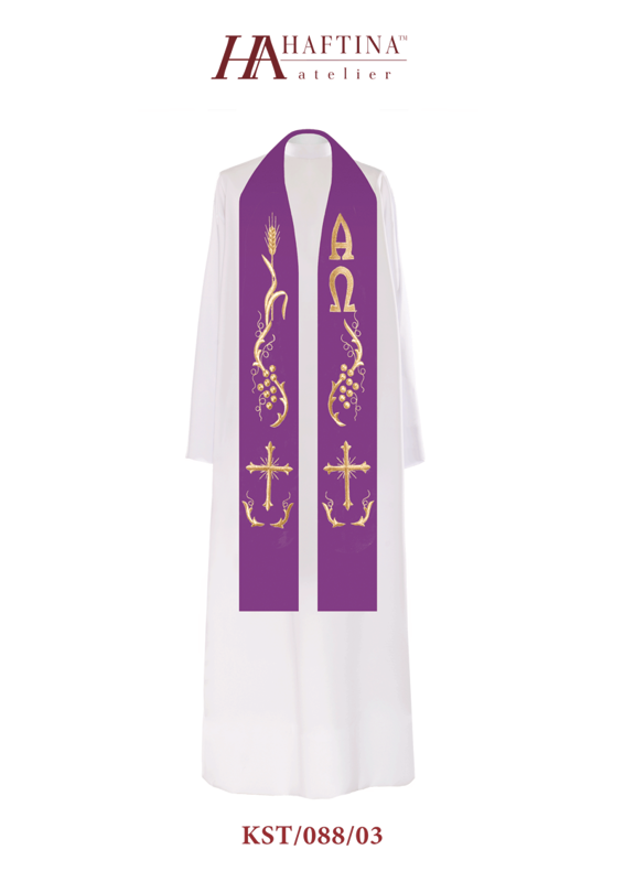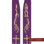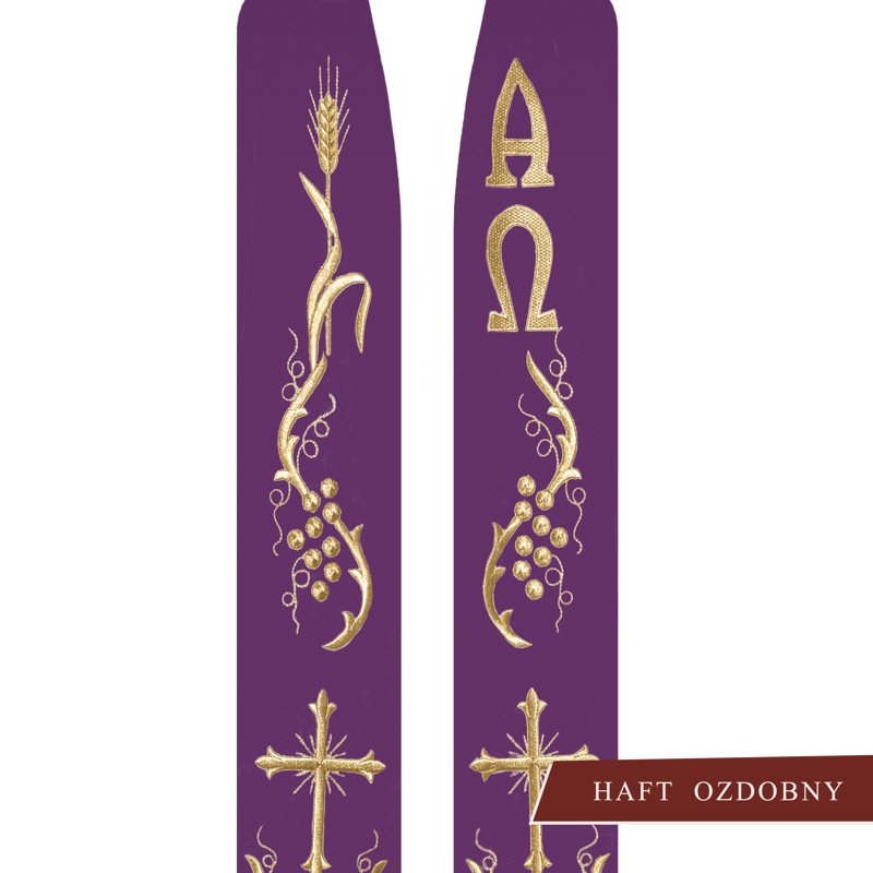 Stuła jednostronna wykonana z wysokiej jakości tkaniny gładkiej, zdobiona bogatym haftem z symbolem eucharystycznym.