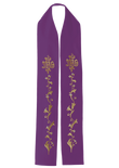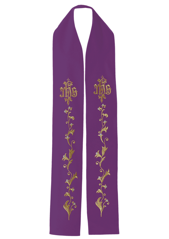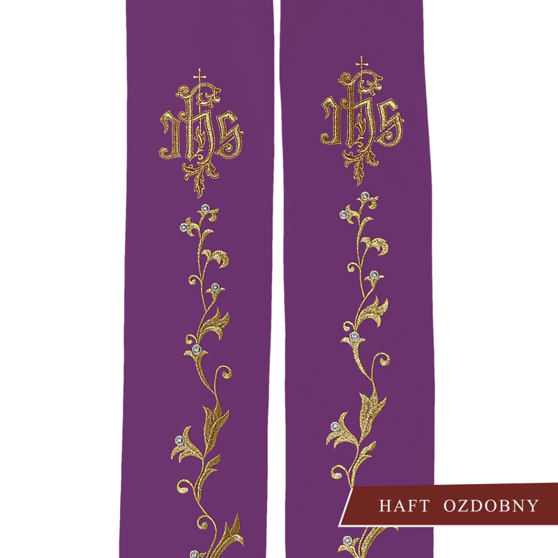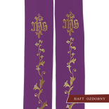 Stuła jednostronna wykonana z wysokiej jakości tkaniny gładkiej, zdobiona bogatym haftem eucharystyczny w kolorze złotym, symbol IHS.