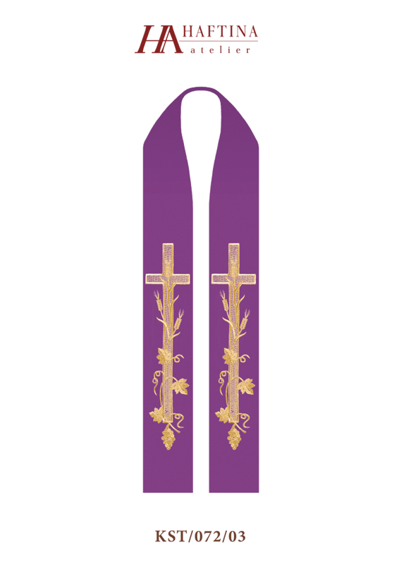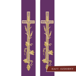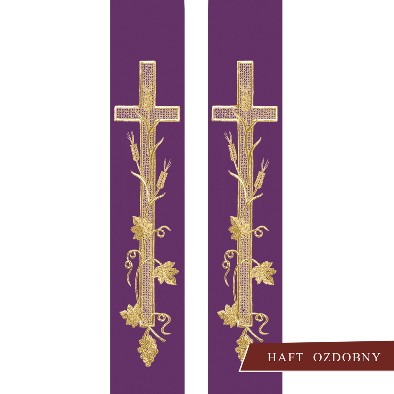 Stuła jednostronna wykonana z wysokiej jakości tkaniny gładkiej, zdobiona bogatym haftem z symbolem Krzyża.