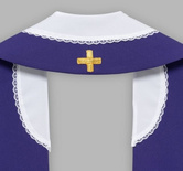 Stuła kapłańska w kolorze fioletowym, symbolizującym pokutę i refleksję, ozdobiona haftem z motywem krzyża jerozolimskiego. Jest to stuła jednostronna, o szerokim kroju, idealna do użytku liturgicznego w okresach Adwentu i Wielkiego Postu oraz podczas sakramentu pokuty.