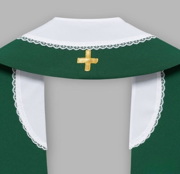 Ta zielona, wąska stuła jednostronna z haftowanym złotym krzyżem będzie godnym elementem stroju liturgicznego każdego kapłana, podkreślając nadzieję i wiarę w Zmartwychwstanie w okresie zwykłym roku liturgicznego.