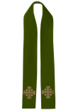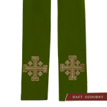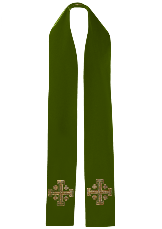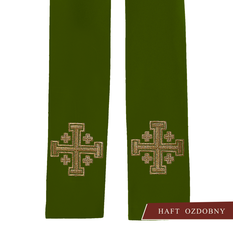 Stuła jednostronna wykonana z wysokiej jakości tkaniny gładkiej, zdobiona bogatym haftem z symbolem Alfa i Omega.