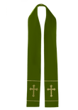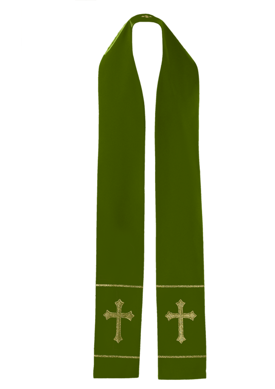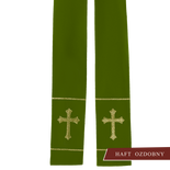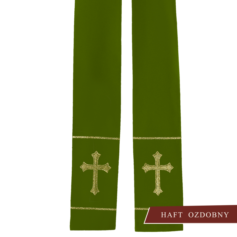 Stuła jednostronna wykonana z wysokiej jakości tkaniny gładkiej, zdobiona bogatym haftem eucharystyczny w kolorze złotym.