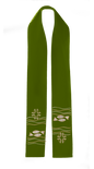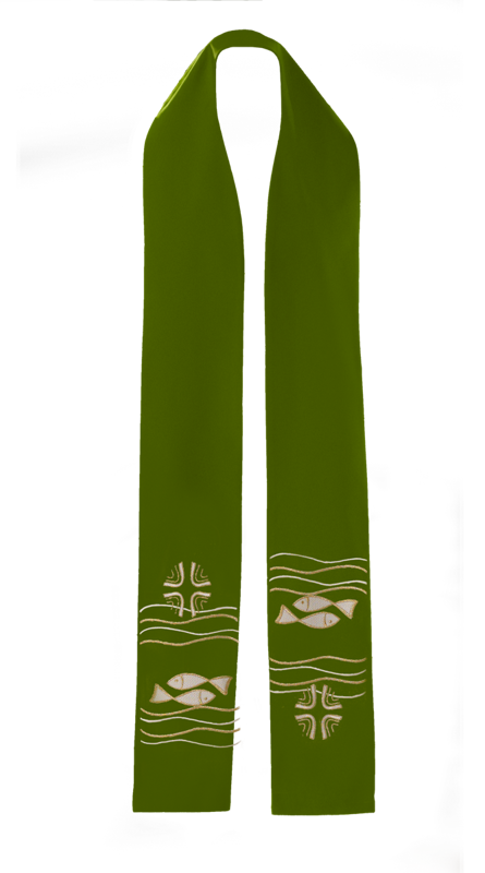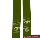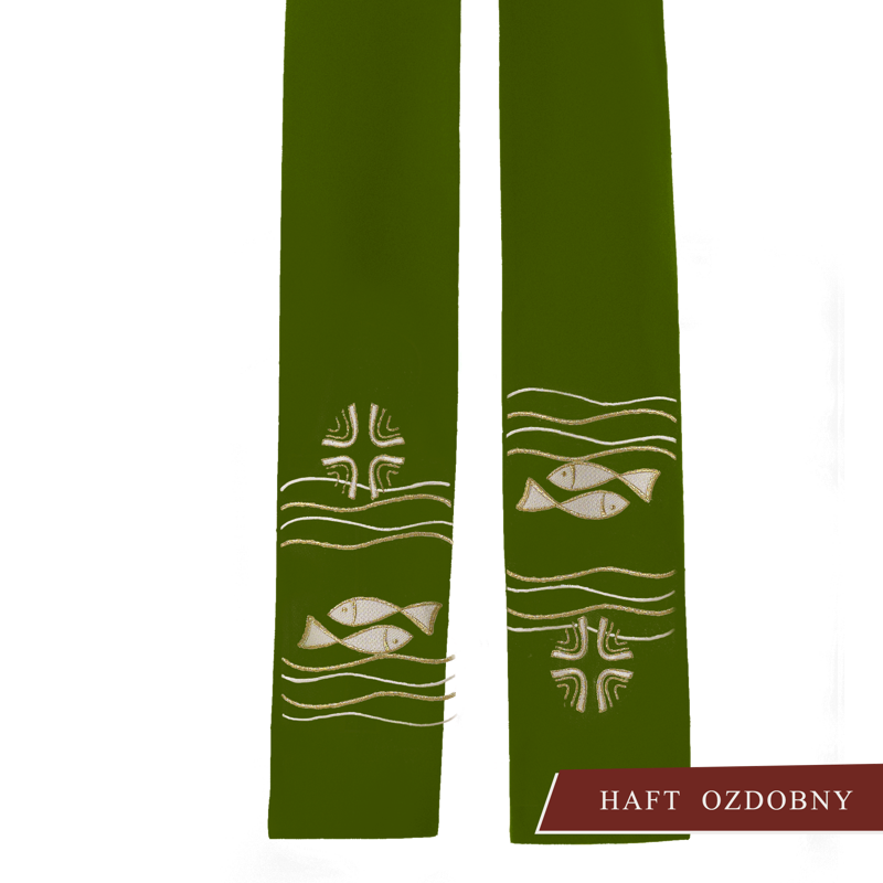 Stuła jednostronna wykonana z wysokiej jakości tkaniny gładkiej, zdobiona bogatym haftem z symbolem Ryby.