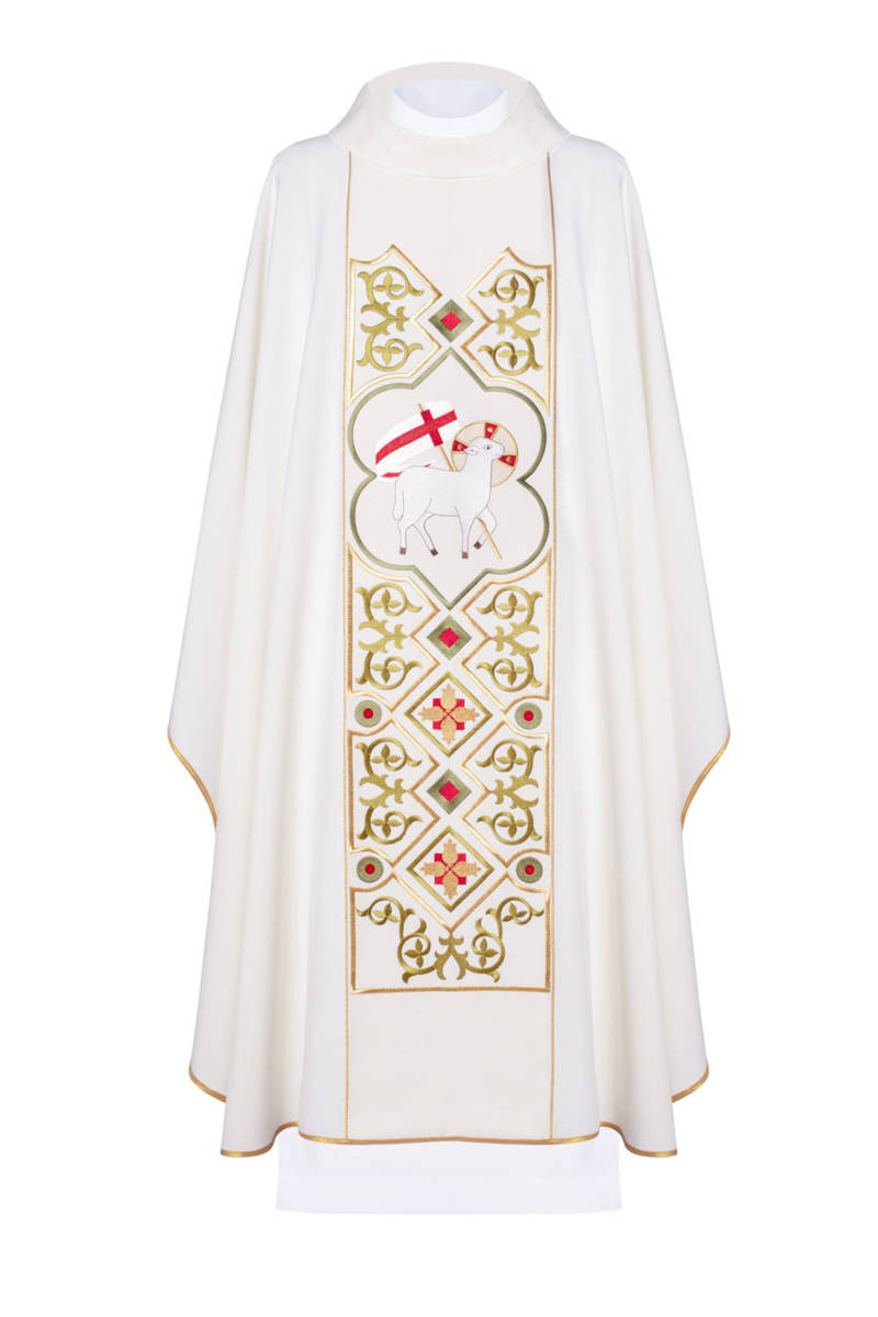Ornat wykonany z wysokiej jakości tkaniny gładkiej, zdobiony pasem z haftowanym symbolem Baranka. Całość wykończona złoto-satynową lamówką.