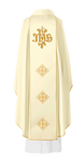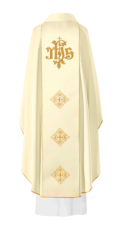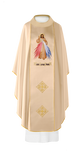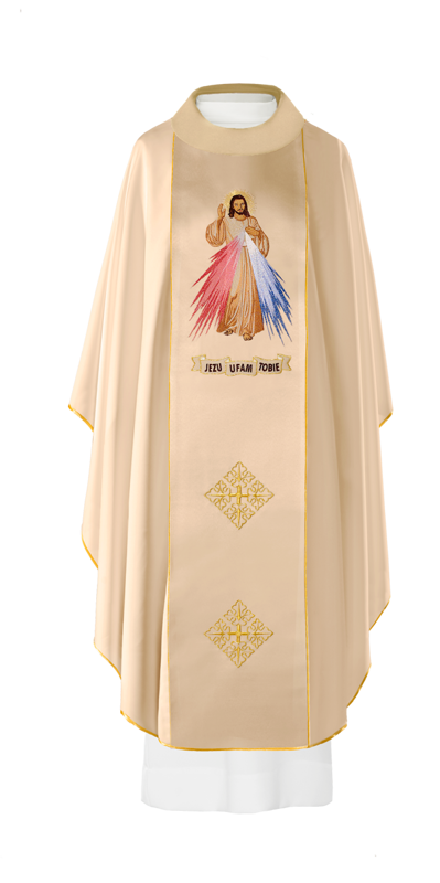 Ornat wykonany z wysokiej jakości tkaniny gładkiej, zdobiony pasem z haftowanym wizerunkiem Miłosierdzia Bożego z napisem "Jezu ufam tobie" Całość wykończona złoto-satynową lamówką. Ornat złoty
