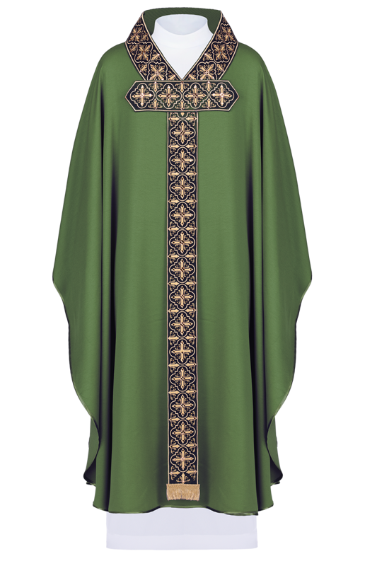 Ornat wykonany z bardzo wysokiej jakości tkaniny gładkiej. Szata z bogato haftowanym pasem i kołnierzem z motywem krzyża i udekorowana kamieniami fasetowanymi. Całość wykończona lamówką w kolorze ornatu. Stuła wewnętrzna w komplecie.