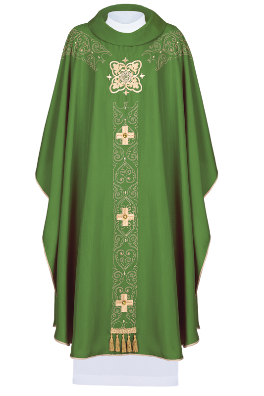 Ornat wykonany z bardzo wysokiej jakości tkaniny gładkiej. Szata haftowana na planie krzyża, wykończona złotymi frędzlami i udekorowana kamieniami fasetowanymi. Całość wykończona lamówką w kolorze ornatu. Stuła wewnętrzna w komplecie.