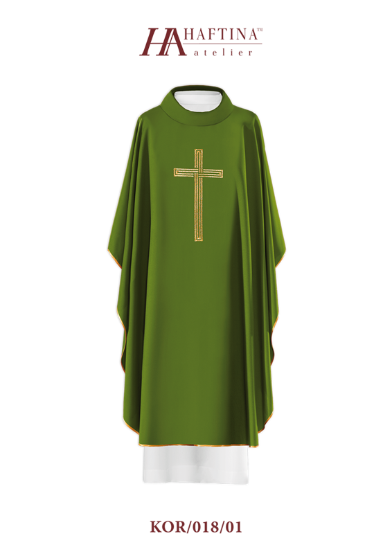 Ornat wykonany z wysokiej jakości tkaniny gładkiej, zdobiony bogatym haftem z symbolem Krzyża. Całość wykończona złoto-satynową lamówką. Dostępny we wszystkich kolorach liturgicznych.