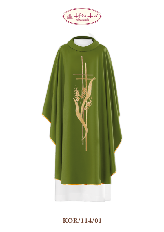 Ornat bogato zdobiony haftem w kolorze złotym. Wykonany z wysokiej jakości tkaniny gładkiej. Całość wykończona złoto - satynową lamówką. Standardowa długość szaty 130cm. Dostępny we wszystkich kolorach liturgicznych. Wykończenie kołnierza typu golf, jest możliwość zamówienia kołnierza typu karo. Ornat ze stułą wewnętrzną w komplecie. Tkanina standard 80%PE,20%WOL