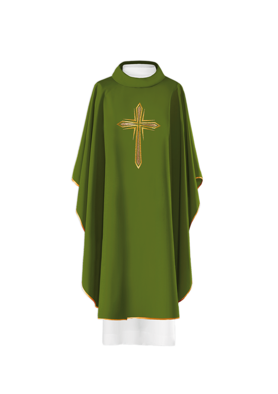 Ornat wykonany z wysokiej jakości tkaniny gładkiej, zdobiony bogatym haftem z symbolem Krzyża. Całość wykończona złoto-satynową lamówką. Dostępny we wszystkich kolorach liturgicznych.